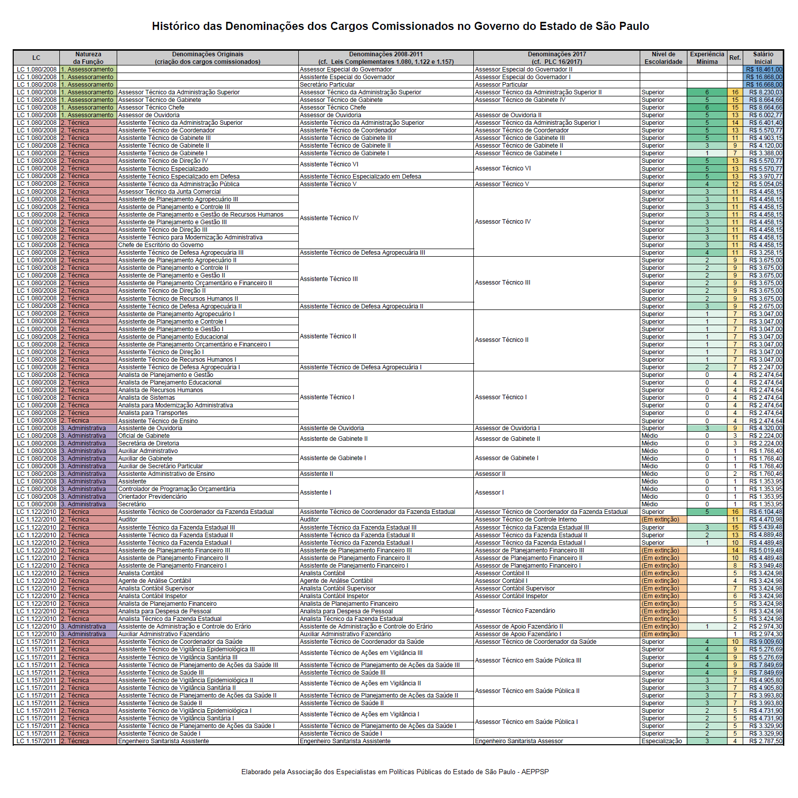Você pode assistir à reportagem e conferir a tabela completa com todo o levantamento elaborado pela AEPPSP que demonstra como funciona a “alquimia da renomeação de cargos comissionados ilegais” utilizada pelo governo paulista para disfarçar os mais de 80 tipos de cargos comissionados criados para realizar funções técnicas ou administrativas já na sua origem. Conforme a reportagem mostrou, o texto do PLC 16/2017 enviado pelo Governador Geraldo Alckmin para a Assembleia Legislativa do Estado de São Paulo (ALESP) “muda a denominação dos cargos para que eles pareçam menos técnicos“. Anexo abaixo você pode conferir também, na íntegra, a acusação do Ministério Público, a defesa do Governo e a decisão do Tribunal de Justiça.