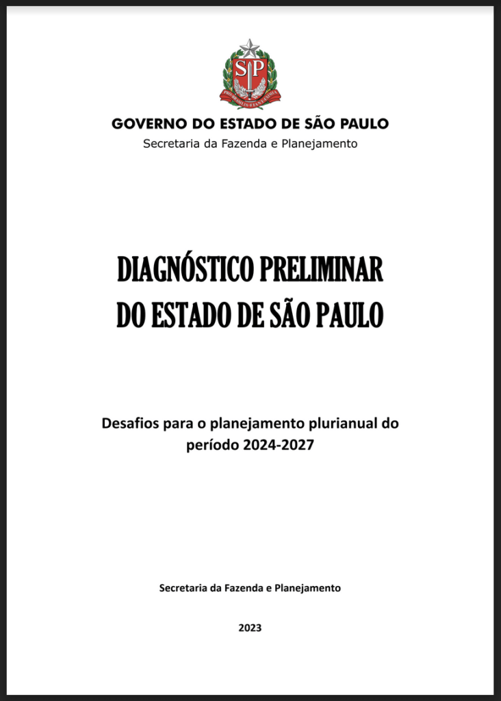 Trata-se da criação de um diagnóstico do estado de São Paulo sintetizando documentos oficiais, planos setoriais nacionais e estaduais, e estudos de órgãos de pesquisa. Procurou mostrar a condição em que o estado de São Paulo entrava no ano de 2023 como ferramenta preparatória do ciclo de planejamento 2024-2027, o qual se inicia com o Plano Plurianual que será elaborado em 2023.