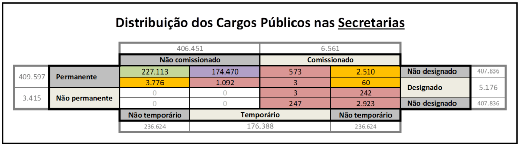 O código de cores utilizado nas duas tabelas está padronizado e refere-se à tipologia de cargos utilizada no presente estudo: em vermelho os comissionados puros, em laranja os comissionados efetivos, em lilás os temporários e em verde os efetivos puros. A composição das quatro dimensões, consideradas as especificidades dos vínculos de cada tipo de cargo, é o que conforma a tipologia dos cargos públicos utilizada neste estudo e garante que os números contabilizados para cada tipo de cargo não se confunde nem se sobrepõe aos demais.