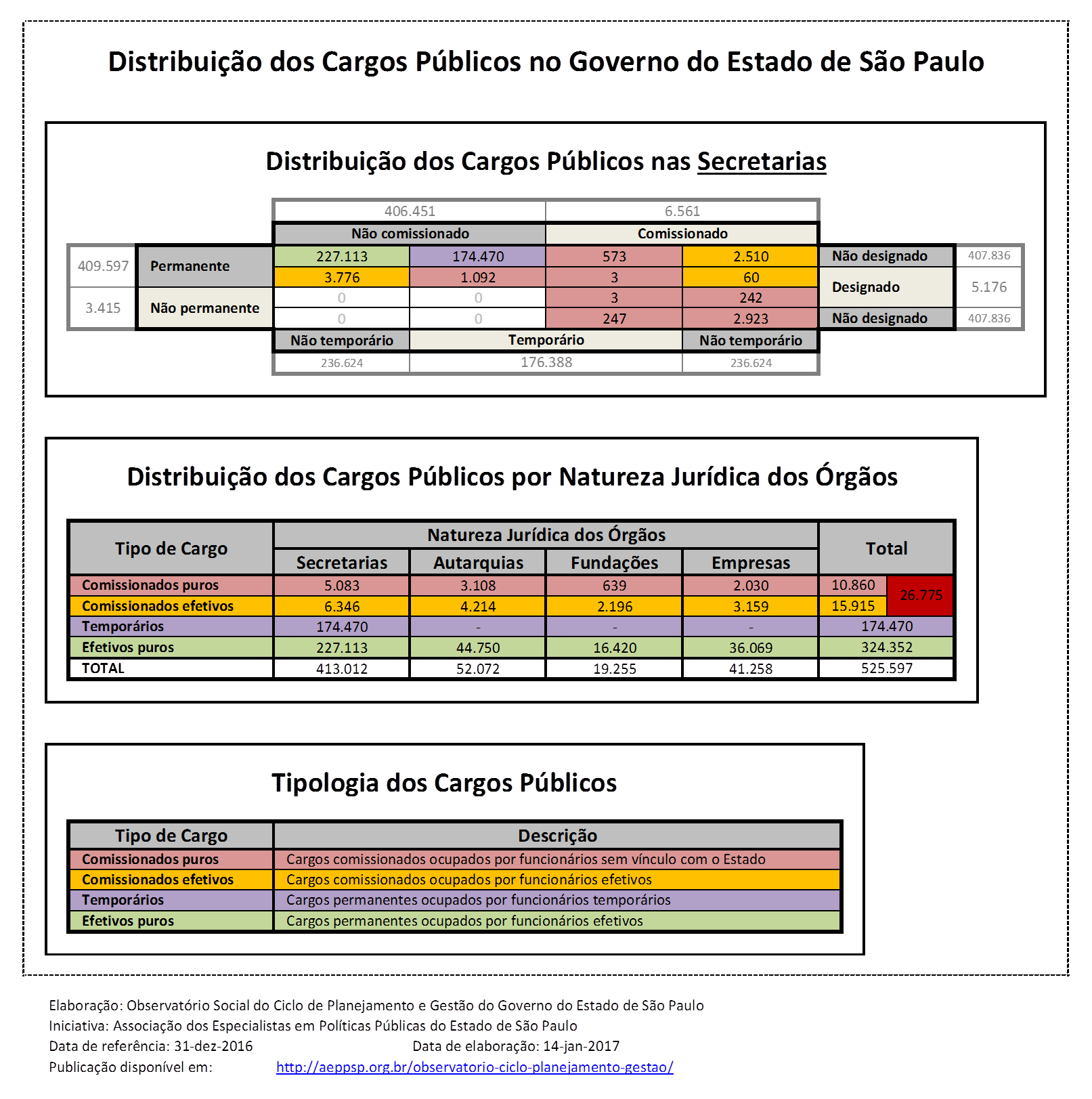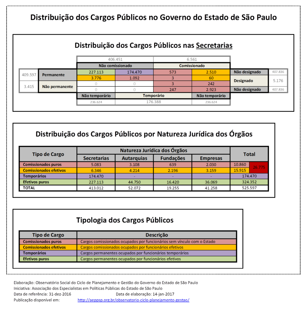 Ao investigarmos os conjuntos de dados oficiais do Governo do Estado de SP chegamos aos seguintes números consolidados tendo como data-base dezembro de 2016: ao todo são 26.775 cargos em comissão ocupados, dos quais 10.860 por funcionários sem vínculo com o Estado (comissionados puros) e 15.915 por funcionários com vínculo com o Estado (concursados e CLT). Possui, também, 174.470 funcionários contratados em regime temporário ocupando cargos permanentes e 324.352 funcionários efetivos ocupando cargos permanentes. Não estão disponíveis nos conjuntos de dados oficias utilizados nesta pesquisa e, portanto, não foram aqui contabilizados, os números referentes ao efetivo da Polícia Militar. Todos os números dizem respeito a funcionários ativos, ou seja, não estão contabilizados aposentados nem pensionistas.