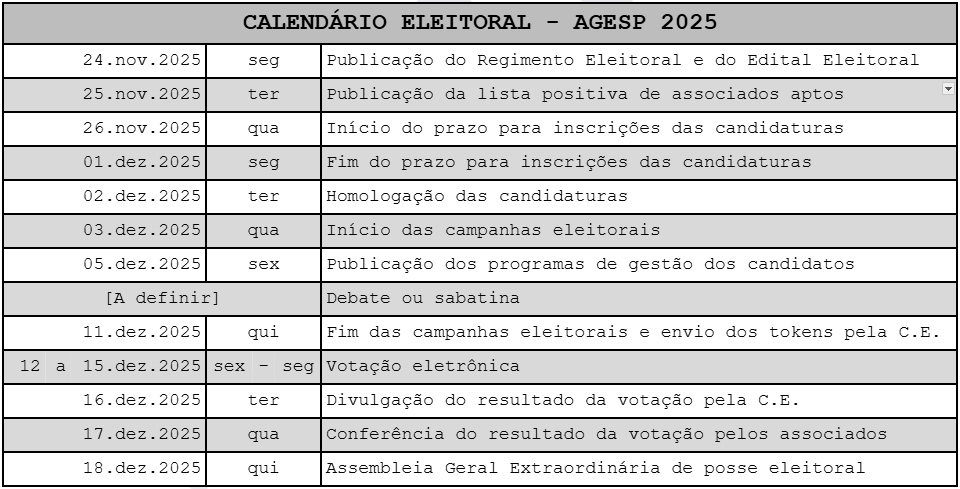 A AGESP torna públicas as minutas do Regimento Eleitoral, Edital e Calendário que serão discutidos na Assembleia Geral Extraordinária convocada para 18/11/2025. Estes documentos estabelecerão as regras, prazos e procedimentos que orientarão todo o processo das Eleições AGESP 2025. Além das minutas, disponibilizamos um formulário eletrônico e uma planilha que automatizam o processo eleitoral, assegurando transparência do processo e sigilo do voto. Esses recursos permitem conferência prévia e auditoria por qualquer associado interessado. Confira abaixo as minutas completas.