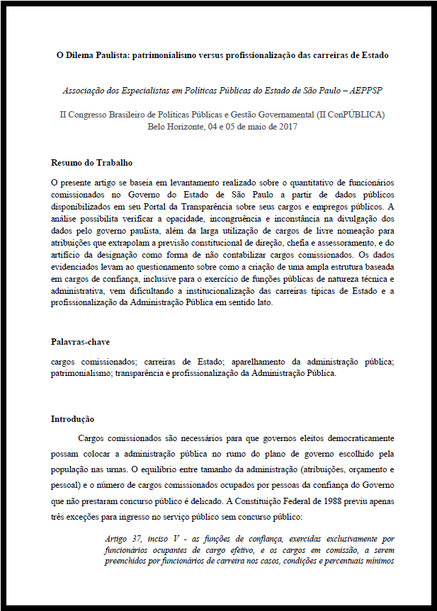 cargos comissionados; carreiras de Estado; aparelhamento da administração pública; patrimonialismo; transparência e profissionalização da Administração Pública.