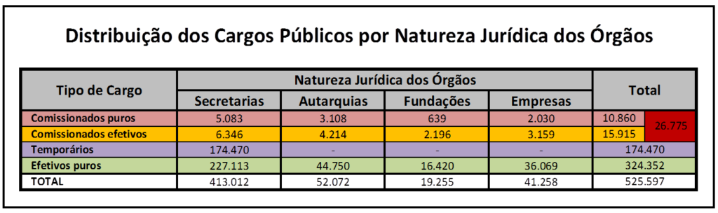 O Governo do Estado de São Paulo possuía ao todo mais de 26.000 cargos comissionados em suas Secretarias, Autarquias, Fundações, Sociedades de Economia Mista e Empresas Públicas segundo levantamento feito em 2017 por servidores vinculados à RACESP. Tem sido uma moda nos últimos anos a extinção de órgãos públicos, algo que desorganiza e degrada a contrapartida do Estado na prestação de políticas públicas para os paulistas que mais precisam.