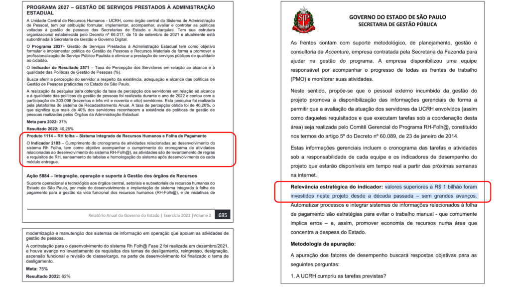 No entanto, a Unidade Central de Recursos Humanos (UCRH) continuou realizando contratações sem licitação para manutenção e desenvolvimento do sistema RH Folha. Em 2023, já sob o novo governo, a UCRH contratou mais de R$ 4,8 milhões para “manutenção do sistema RH Folha Vida Funcional” e mais de R$ 21,2 milhões para “desenvolvimento de novas funcionalidades do sistema RH Folha”.
