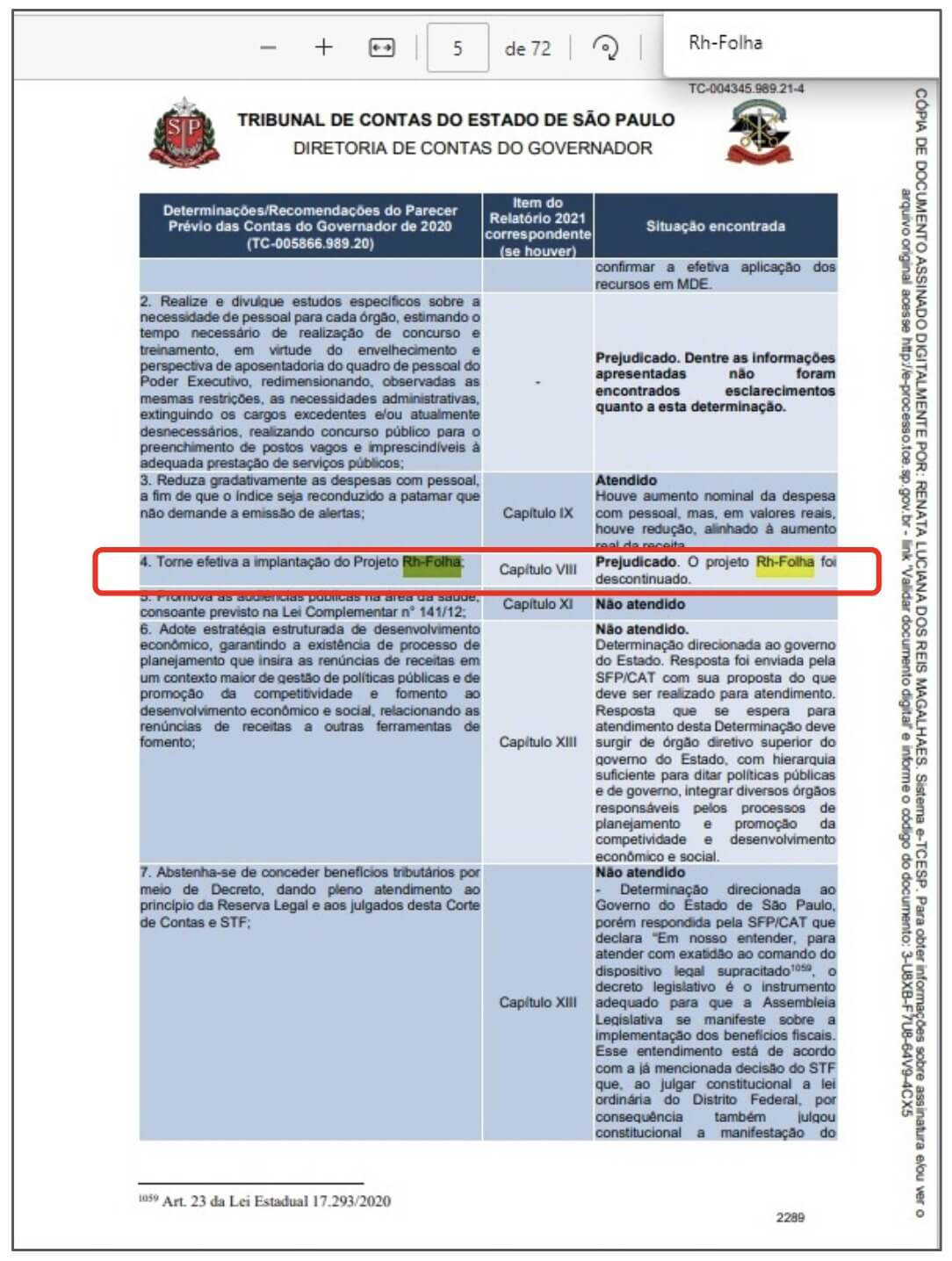 - Tribunal de Contas do Estado de São Paulo – Determinações/Recomendações do Parecer Prévio das Contas do Governador de 2020, p. 2289.