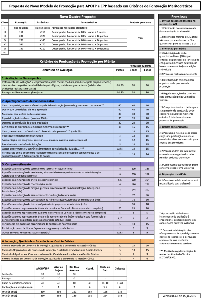 O atual critério para promoção – prova teórica – é desconectado de uma avaliação fática, eficiente, justa e meritocrática da efetiva atuação profissional dos servidores. Uma solução seria a criação de dois eixos independentes com métodos de avaliação complementares: um instrumento de avaliação de desempenho com critérios objetivos para a progressão no eixo horizontal, e uma avaliação teórica e/ou prática para a promoção no eixo vertical.
