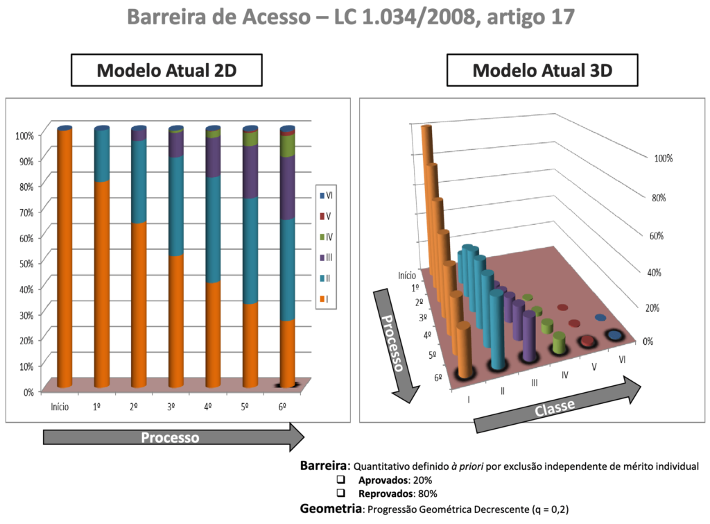 O artigo 17 da LC 1.034/2008 determina que apenas 20% do contingente de cada classe na data de abertura do processo poderá ser promovido. Esta barreira impede o crescimento na carreira de 80% do contingente de cada classe e, consequentemente, bloqueia também o acesso à progressão, uma vez que seu pré-requisito é estar na classe seguinte.