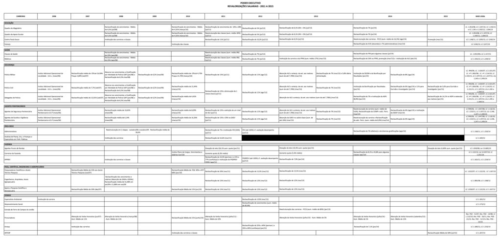 Entre 2013 e 2015 o governo concedeu assistematicamente dezenas de reajustes monetários, inclusive com aumentos reais, para centenas de milhares de servidores pertencentes aos quadros das áreas de Educação, Saúde, Segurança, Penitenciária, Fazendária, Advocacia, Regulação e Administrativa. Foram excluídos, entretanto, os menos de 500 servidores dos quadros efetivos de Gestão – EPPs e APOFPs – apesar de acordo firmado em 2014 pelo Gabinete da Secretaria de Gestão Pública com as duas carreiras.