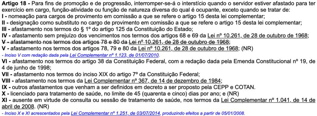 Serve bem como exemplo o artigo 18 da referida Lei Complementar, que define os casos em que o interstício para fins de promoção e progressão é interrompido: são onze exceções colocadas dentro de uma regra de exceção da restrição.